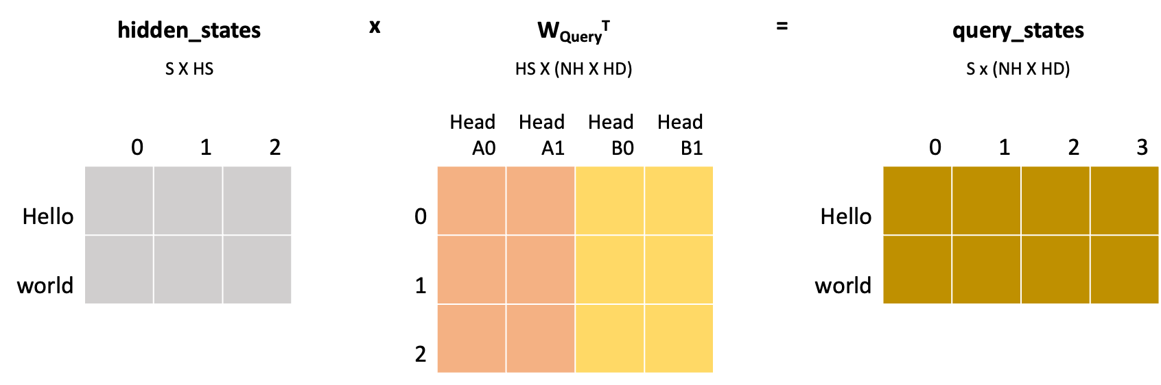 - q_proj(hidden_states): 두 매트릭스의 곱셈으로 B x S x (NH x HD) 차원의 매트릭스 탄생