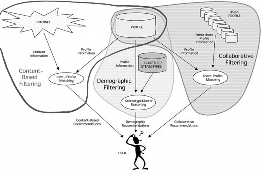 비교적 오래된 논문에 실린 내용이지만, 각 접근법(approaches)들의 공통점과 차이점, 그리고 파이프라인을 직관적으로 잘 표현한 그림입니다. 그림에서 알 수 있듯, recommendation system은 다음의 세 줄기로 요약할 수 있습니다.