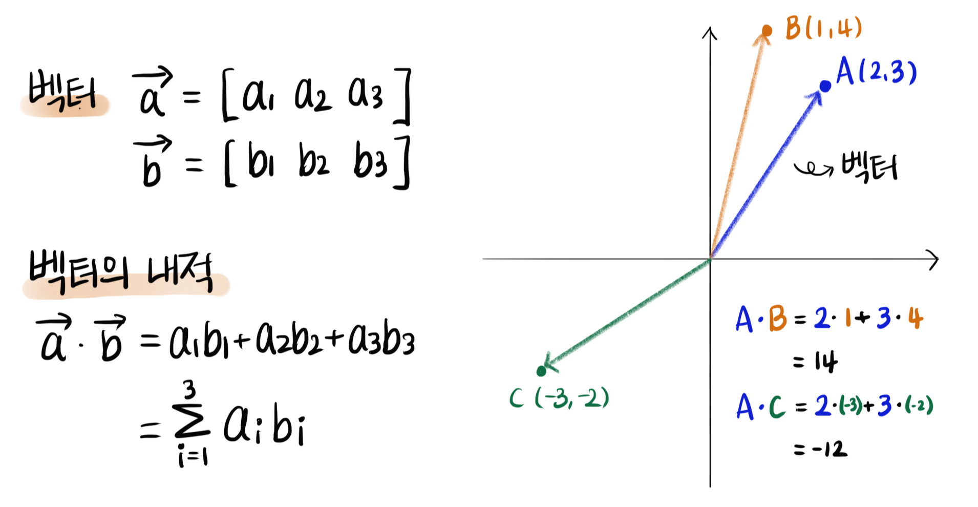 이해를 돕기 위해 2차원 평면상에 있는 두 벡터를 가정해보겠습니다. 위의 그림에서 우리는 벡터 A는 벡터 B와는 비슷하지만 벡터 C와는 굉장히 다른 아이라는 걸 직관적으로 알 수 있습니다. 이제 각 쌍의 내적을 구해보면, 서로 비슷한 '벡터 A - 벡터 B' 쌍의 내적이 서로 다른 '벡터 A - 벡터 C' 쌍의 내적보다 크다는 걸 확인할 수 있습니다.