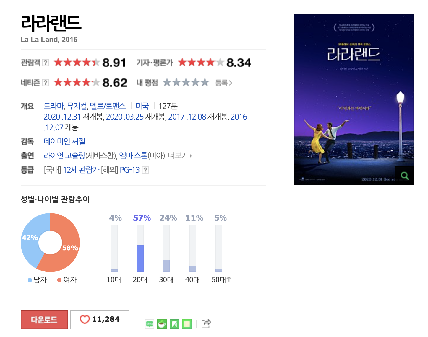 조금 더 쉽게 떠올리실 수 있도록 '수달이'에게 '영화'를 추천해주는 상황을 가정하고, 저의 ❤인생 영화❤인 '라라 랜드'를 예로 들어 이야기해보겠습니다. 아래의 사진은 네이버 영화에서 '라라 랜드'를 검색했을 때 나오는 페이지인데요. 여기서 볼 수 있는 모든 정보들이 추천 시스템에 활용될 수 있습니다. 장르, 제작 국가, 감독, 출연 배우, 등급 등 영화에 대한 기본 정보는 물론이고, 성별/나이별 관람추이 같은 숫자형 정보도 활용할 수 있습니다.