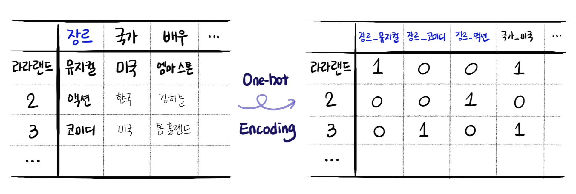 하지만 이런 텍스트 형태는 기계가 이해하기 힘들기 때문에 숫자로 변환해 주는 작업을 거쳐야 합니다. 예를 들어, '장르'라는 feature에 뮤지컬, 액션, 코미디라는 세 카테고리가 존재한다면, '장르_뮤지컬' '장르_액션' '장르_코미디'와 같이 각 카테고리를 단독적인 feature로 만들어줍니다. 그리고 해당 장르에 속하면 1로, 그렇지 않으면 0의 값을 부여합니다. 이러한 과정은 one-hot-encoding, 원-핫 인코딩이라고 불립니다.